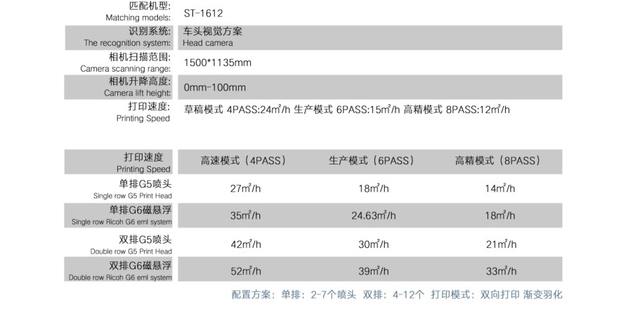 經(jīng)典款理光G5配置:草稿模式 4PASS:24㎡/h 生產(chǎn)模式6PASS:15㎡/h 高精模式 8PASS:12㎡/h