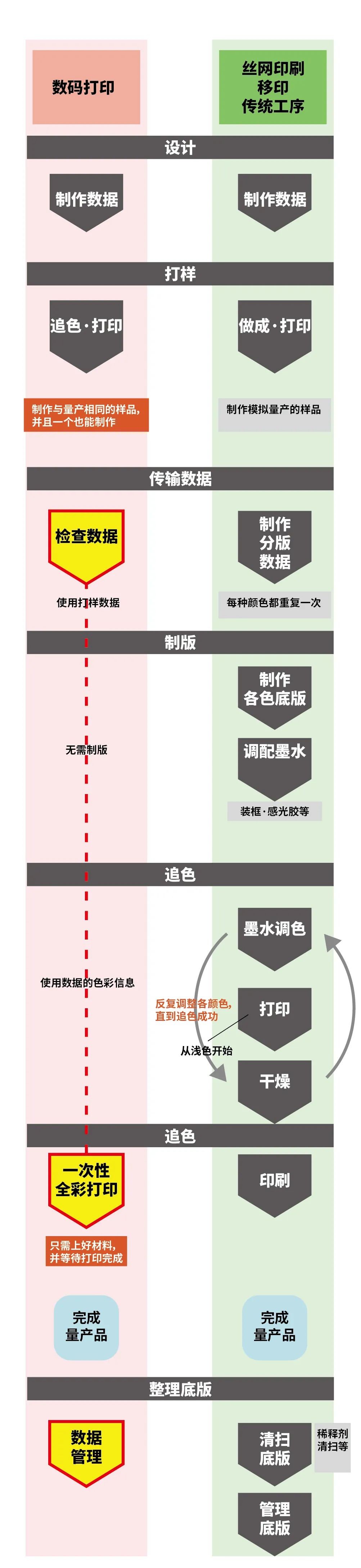 以往的傳統印刷中,需在生產前使用必要分量的墨水來追色,數碼打印中則不需要。