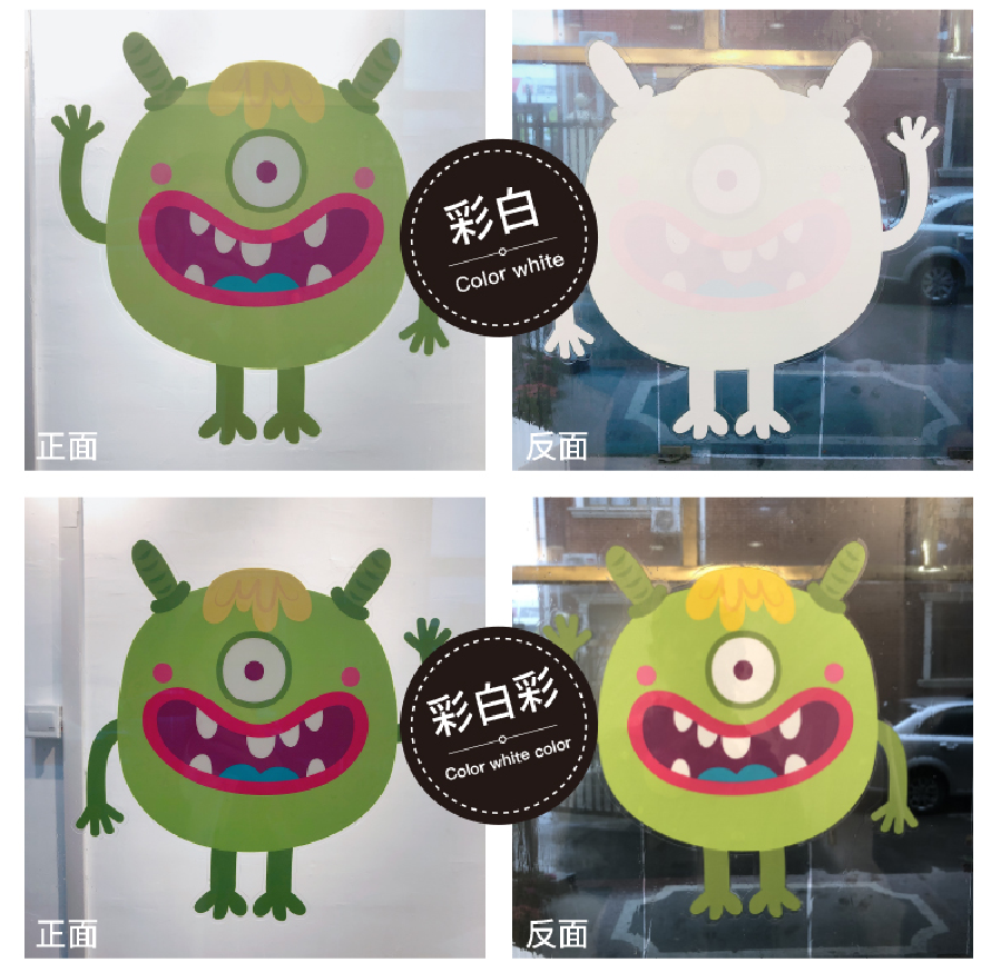 UV打印的時候先打印彩墨,然后鋪一層白墨,最后再打印一層彩墨。UV彩白彩色彩飽和、畫面精度高,正反畫面都絢麗奪目,無論是產品廣告,還是裝飾圖案,使得彩白彩超透櫥窗貼紙畫面具備立體感和高亮度。