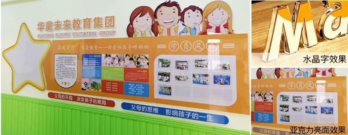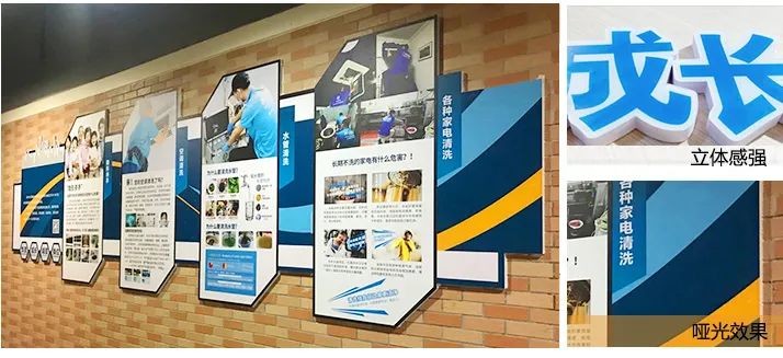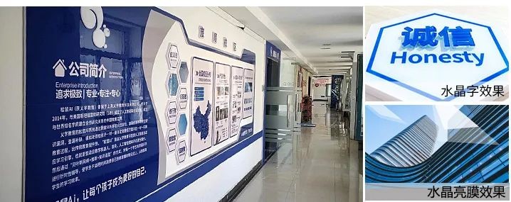 工藝:PVC覆鋼化貼、膚感貼再加異形包覆側噴、側面噴漆、熱熔封邊、鋼化無框折彎的工藝,配合磁性畫面、焗漆水晶字等最新工藝,將每個文化墻做成手工藝品。