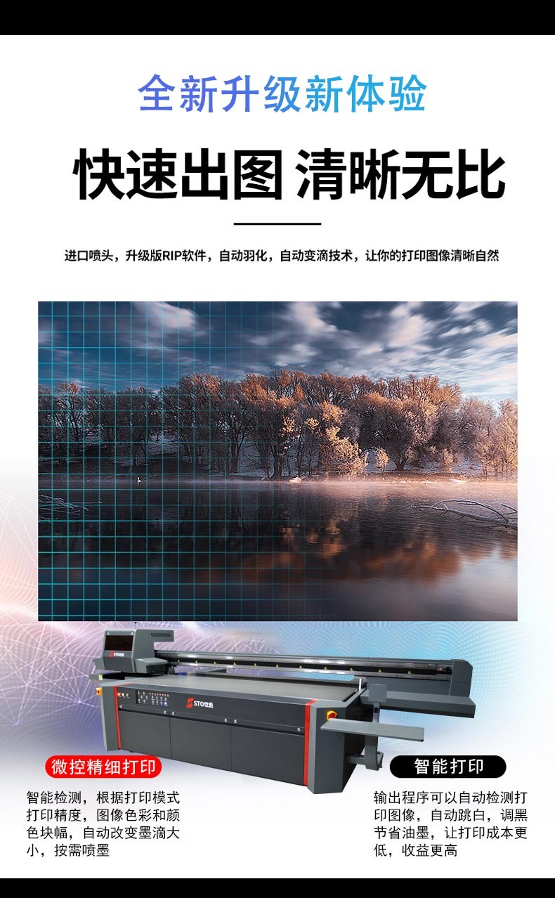 1、全新采用3-8個灰度級理光(Ricoh)內加溫工業電噴頭,4-7色可選(6色或者6+2雙白或者2彩+1白+1光油)可變墨滴打印,小7pl大35pl,墨滴更密集,照片級精度,多色打印,色彩更亮麗,變化 更豐富,能清晰打印3px字體,不僅打印精度高而速度快,分辨率600*1200 dpi。G5噴 頭使用壽命長 ,工作穩定,非常適合長時間工作,24小時運行,維護良好的情況下,使用達5年。 1、UV平板打印機具備自動覆白、白底、專色等16種白墨打印方式,并且可以同時打印白墨與特殊效果的光油。 2、UV打印機具備顯著提高生產效率的自動跳白打印功能,能夠自動識別打印高度并且避開畫面中的空白部分。 3、UV平板打印機可設定兩個UV燈管的照射功率,雙向打印時按照往返方向自動輪 換,能夠有效減少深淺PASS道。 4、理光UV打印機強大的噴嘴補償功能可用功能正常的噴嘴替代故障噴嘴進行噴墨 打印,確保畫面不會出現露白或者PASS道。 5、UV平板打印機配備功能強大的智能化、人性化的RIP軟件,不同的畫面可以重疊之后照樣輸出,方便了日常的打樣校色工作,出圖效率大幅提高。 6、UV平板打印機可選軟件模版打印技術解決了拼接中的誤差問題,使拼接誤差小于0.5mm。 7、可選的流水線打印模式適應工業化在線生產。 世通高落差玩具UV打印機,自主研發生產,進全鋼一體機架,打印速度快,精準高效,實現高落差打印,無須制版,電腦出圖一體印刷成形,方便快捷,廣泛應用于皮革箱包、手機殼、廣告標識標牌、各類建材、瓷磚背景墻、木板藝術畫、玻璃材質、金屬材質選等平面材料都可以印刷,世通彩印是UV平板打印機專業制造廠家,價格低,速度快精度高,免費打樣,售后上門維修服務,免費安裝調試,歡迎來電咨詢:13590146361張小姐